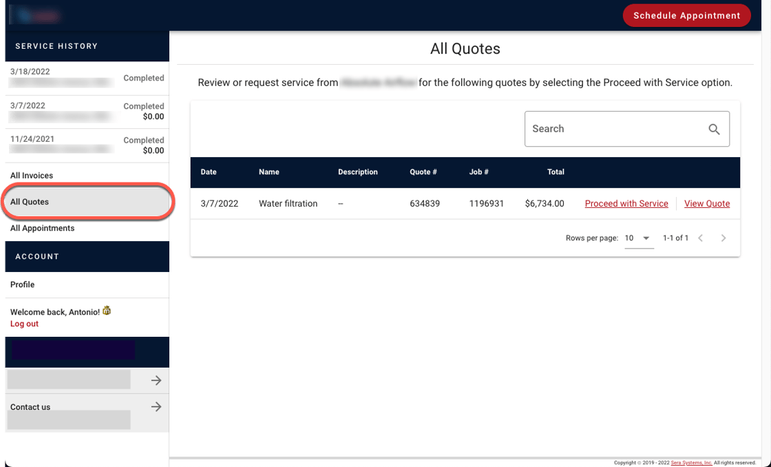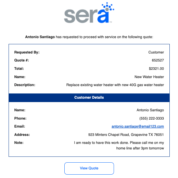 - Customers have the option to "Proceed with Service". Selecting this action will allow the customer to add a comment with additional instructions and will send an automated email to admins who receive emails informing them that the customer would like to proceed with service for this quote.